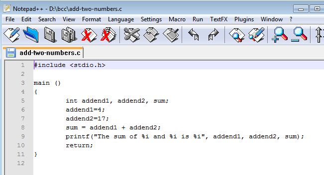 Key this program in, using a text editor. Save it in a file named "add-two-numbers.c". Then, in order to convert it into form that contains correct Intel machine instructions, thus enabling the computer to run it, bring up the Windows command box and give this command: