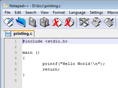 Key this program in, using a text editor (in Windows Notepad or Notepad++ will do; if you use Wordpad or Word be sure to save what you type in a "text" type file). Save it in a file named "printing.c". Then, in order to convert it into form that contains correct Intel machine instructions, thus enabling the computer to run it, bring up the Windows command box and give this command: