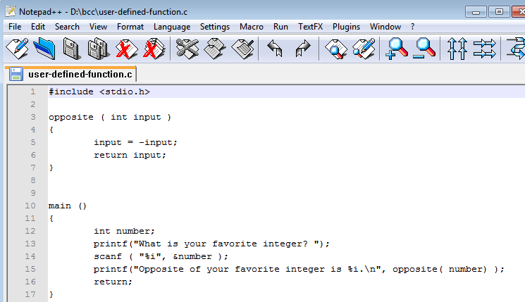 Key this program in, using a text editor. Save it in a file named "user-defined-function.c". Then, in order to convert it into form that contains correct Intel machine instructions, thus enabling the computer to run it, bring up the Windows command box and give this command: