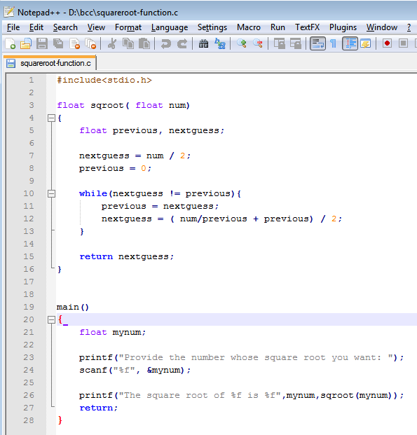 Explanations: The last program, library-function.c, used a function named sqrt( ) that calculates square roots. But that function was not present in library-function.c. Rather it was borrowed (from a place referred to as "math.h"). This current program, squareroot-function.c, does the square root work itself. It contains a function that it chooses the name "sqroot( )". That function contains a loop, that causes some code (lines 11 and 12) to be executed repeatedly for a while.