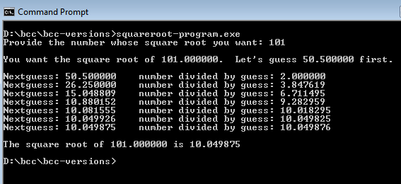 If there are no error messages, a new file named "squareroot-function.exe" will result. Then give the command: