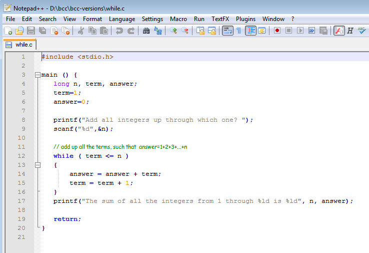 By default each line of code is executed exactly once when your program runs. Then the program moves on to the next line. But sometimes it is desirable to go back and re-run one or more lines a second time, or more. Repeating is called "looping" and is implemented here by C's "while" statement, in line 12. Below it in ines 13 and 16 are a pair of curly brackets. They enclose the lines of code to be repeated, lines 14 and 15. This program's job is produce the answer "what's the sum of the first several integers?" step by step. In each step it adds in another integer, starting with 1. The container into which it adds them in is the variable "answer". If you want it to produce the sum of the first 3 integers it must do this 3 times. If you want it to add the first 100, it must do it 100 times. line 14 takes whatever is in answer (which starts at 0), adds to it the next term, and puts the result back into answer (thus replacing/increasing the value of answer). The "next term" is initially 1. But in line 15 every time the loop runs, it ups it to the next integer getting ready for the next summing. How many times does it do this? That's controlled in the while statement by what's inside its parenetheses, namely "term <= n ". It's called the while's condition. As long as that's true, while keeps going. But if it becomes false, the loop quits and the program moves on (to line 17 where it prints the result). It does become false, because term is always increasing in line 15. Once the program has added in all the integers up to and including the user's chosen one, when it gets ready to go further it stops because the proposed next term is too big (beyond the user's chosen integer).