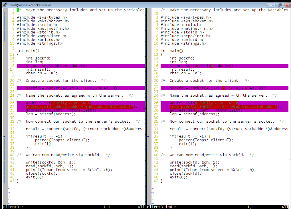 vim -c "syntax off" -d client3.c client3-ip6.c
