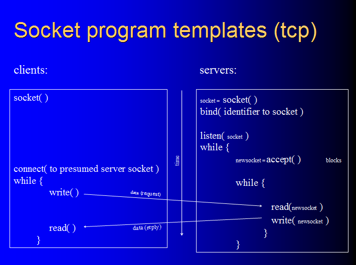 tcp clients and servers have a signature pattern of socket API call utilization, in terms of which ones they call and in which order.. Here are what tcp clients and servers look like: