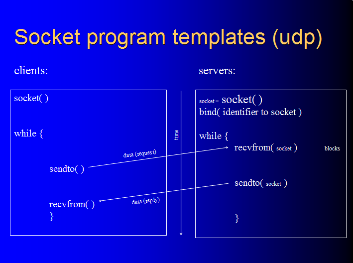 udp clients and servers have a signature pattern of socket API call utilization, different from tcp's. Here are what udp clients and servers look like: