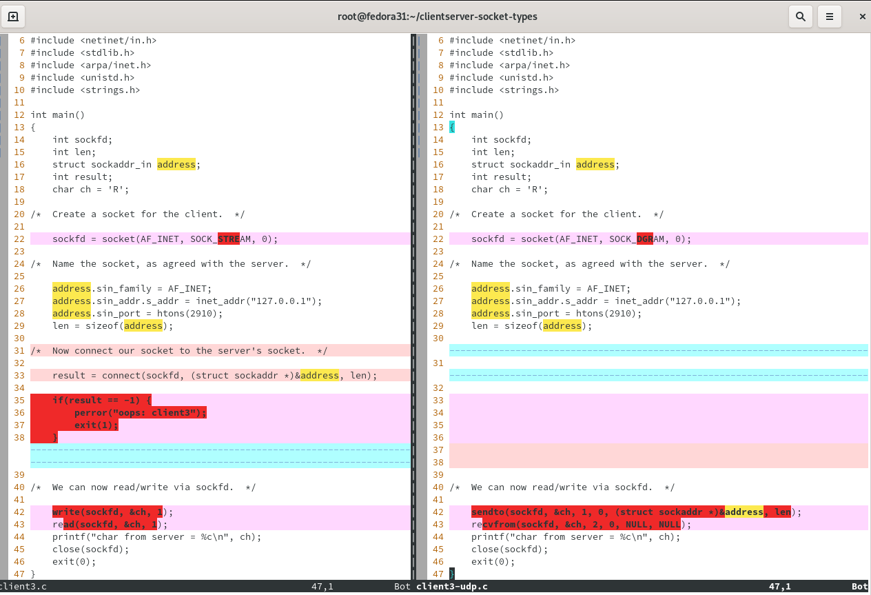 Lines 42-43 - in both cases, reflecting the raison-d'etre and soul of client-server computing, the client sends something and the server receives it; then the server sends something and the client receives it. But the differences are 1) the function calls employed, and 2) the number of arguments. udp needs to operate differently than tcp when sending and receiving. So there are dedicated functions sendto( ) and recvfrom( ) for udp to use, while tcp uses write( ) and read( ). Here, both tcp's write( ) and udp's sendto( ) ask the transport protocol to send one character, supplied at a particular memory address, into/through a particular pre-constructed socket. udp goes a step further, specifying where to send it in the form of a structure (here named "address") that contains the IP and port of a destination. tcp didn't bother with that. Why? It reflects the aforementioned lack of a "connection" in udp. tcp associated the socket (sockfd) with a particular IP/port in line 33's connect( ) call. By telling write( ) which port to use, the destination is unambiguous in tcp. udp by contrast never associates the socket it creates with any particular destination. The same socket can be used to send stuff to different ones. Therefore, the ambiguity must be resolved in each and every sendto( ) call by dictating an IP/port destination at call-time. tcp did it already at connect-time.