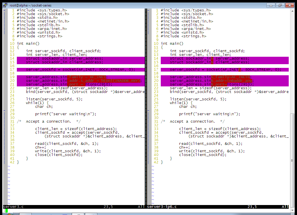 vim -c "syntax off" -d server3.c server3-ip6.c
