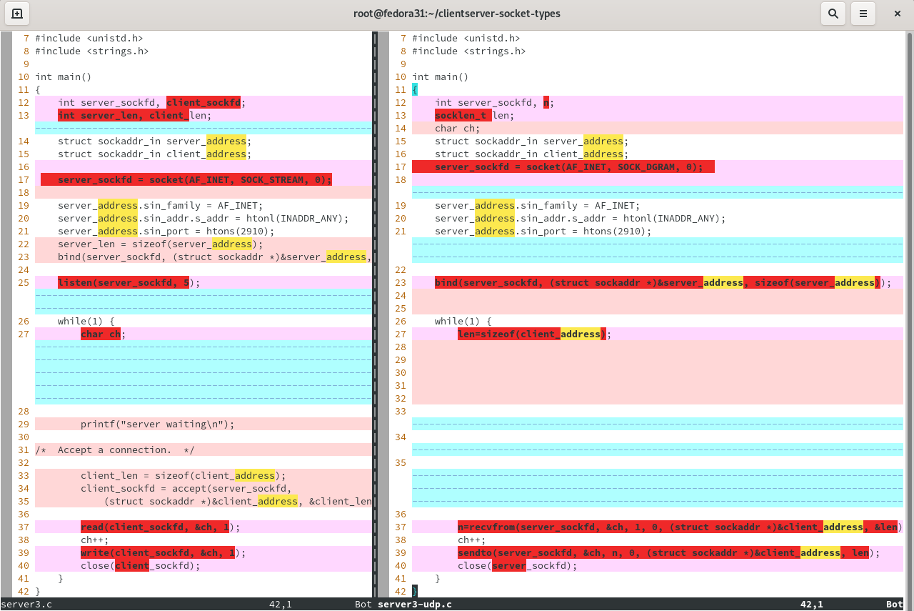 vim -c "syntax off" -d server3.c server3-udp.c