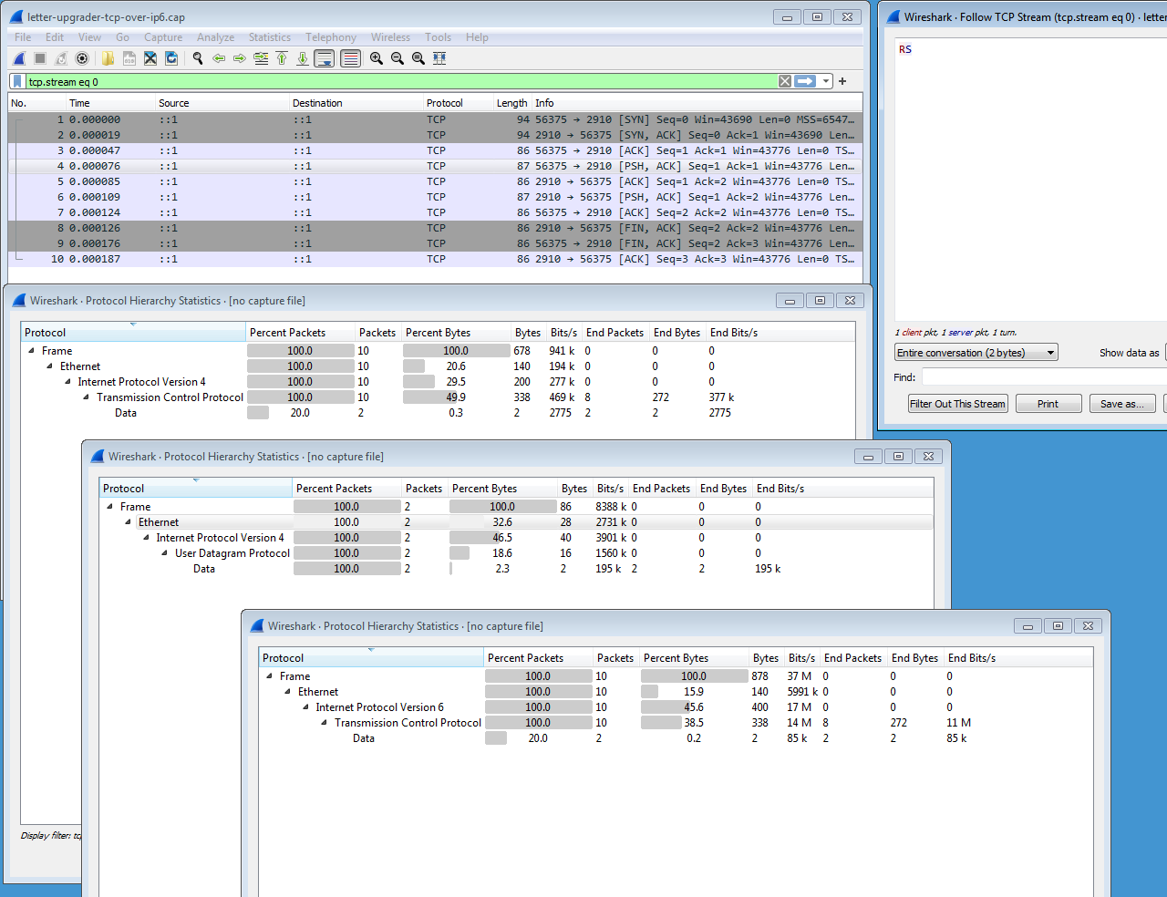 To do so, open letter-upgrader-tcp-over-ipv6.cap in Wireshark. Position it in at the top left of the screenshot. On top of that and below its packet list panel cascade three protocol hierarchy report windows, one for each capture. To obtain them open each capture file in succession and, while open, produce the report from the "Protocol Hierarchy" suboption on the "Statistics" drop-down menu. Position the cascaded reports in the vertical order shown, tcp/ipv4 above udp/ipv4 above tcp/ipv6. Finally, put a window in the upper right that follows the tcp stream from the ipv6 capture (in the ipv6 capture window you've opened at the top of the screen, right click on any frame and choose "Follow," then "TCP Stream."