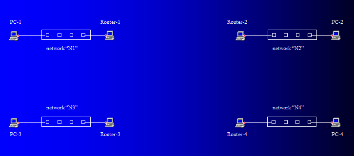 This is a simulation of an in-class hands-on lab exercise. In it, students create 4 small networks. Then the 4 networks