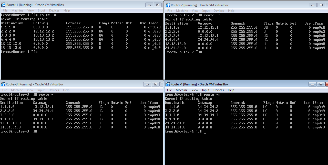 Third, a screen shot showing the tiled screens of your 4 Routers. Each should show that router's route table. Here is my screenshot. Yours should be just like mine, though you will presumably have different numbers than those I chose.