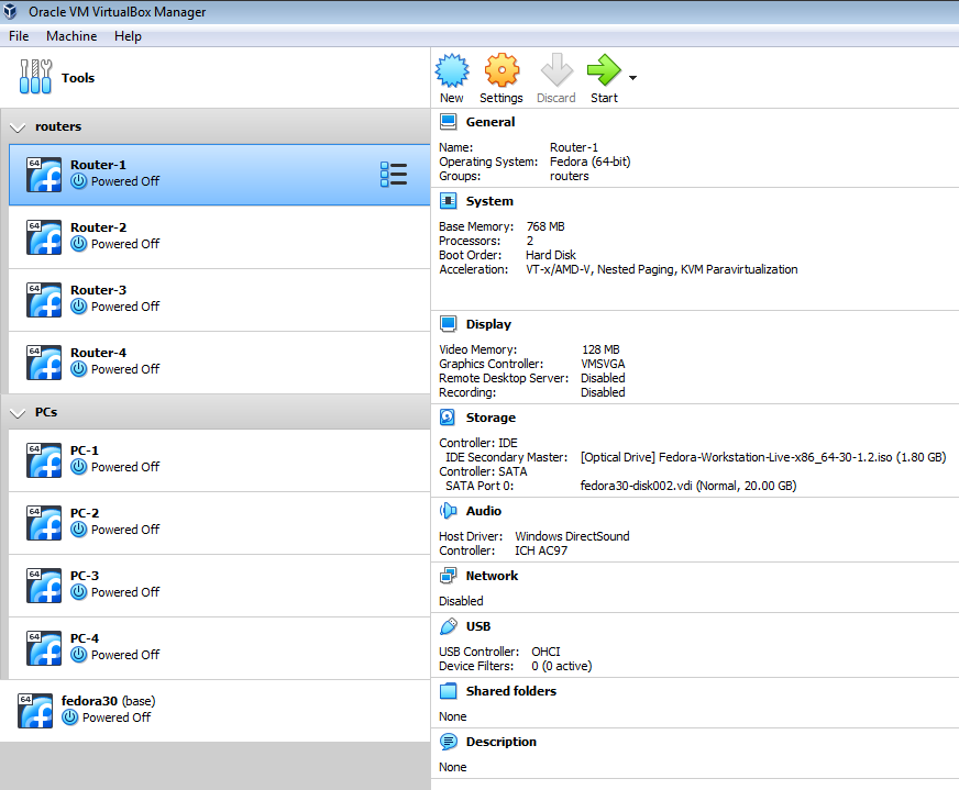You are provided a base VirtualBox VM named fedora30 (or similar). You are also provided with scripts that create 8 VMs within VirtualBox, by cloning 8 copies of fedora30 (to do it, consult the readme.txt in the zip file yielded by the preceding link).. After populating VirtualBox with these VMs they will appear in the VirtualBox Manager as in Figure 1 (immediately after cloning the two groupings won't be shown, but appear if you exit then re-run the Manager):