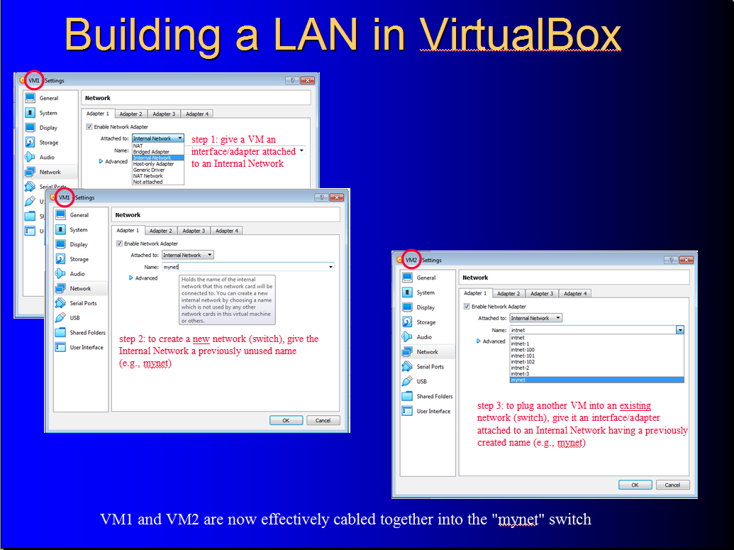 The physical "cabling together" step is what needs to be done in the VirtualBox manager. The figure below models how to cable two machines together. It creates a LAN named "mynet" that includes/joins 2 computers named "VM1" and "VM2". It is performed, for a given computer, within the computer's VirtualBox network settings. Creating a name there for a VirtualBox "Internal Network" in effect produces a switch. It also cable-connects to it the VM within whose settings you create that name. In settings for other VMs thereafter, you can attach them to that same Internal Network by name, and in effect you thus plug them together into the same switch. An Internal Network name corresponds to a switch and thereby, like with a real one, to a LAN.