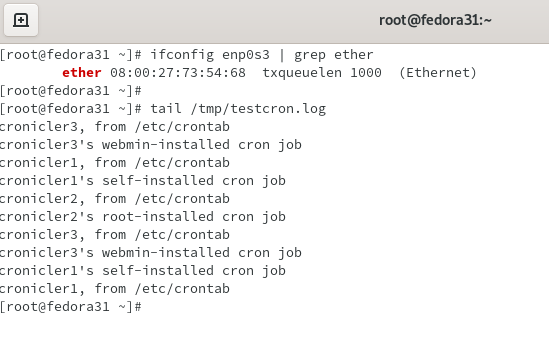 In your root terminal window run a command the reveals your hardware address and the recent entries in your cron log file: