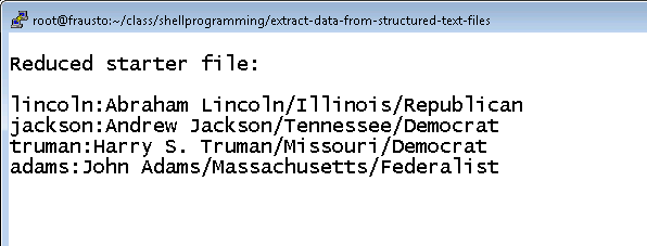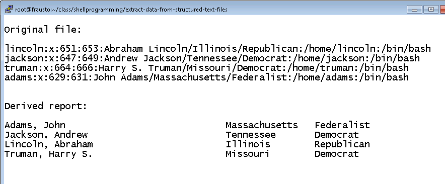 The passwd file has a well known, 7-field stucture. All but the 5th field have well defined content. That field is in effect a comment. Standard utilities don't use it for anything. You can put whatever you want in it. Imagine the passwd records for several U.S. presidents, in which the comment field is utilized to hold a president's name, home state, and party affiliation. From it, we wish to programmatically produce a report with certain content and format. Both the passwd file (raw material) and derived report (finished product) are shown below. (Obtain the abbreviated passwd file shown, holding four past U.S. presidents.)