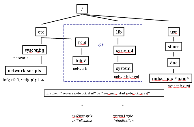 If you have multiple interfaces, there will be one "ifcfg-<interface name>" file for each. Running the initialization consists of invoking the command shown in the filesystem diagram, depending which initialization mechanism is installed on your computer (actually configuring the files is done identically, independent of init mechanism). Incidentally, the script that processes these files does so by looping across files in this directory. By there mere presence they get swept up in the processing net. So if you save a copy of an "ifcfg-..." file under another name in order to experiment with the original, don't leave the copy in this directory.